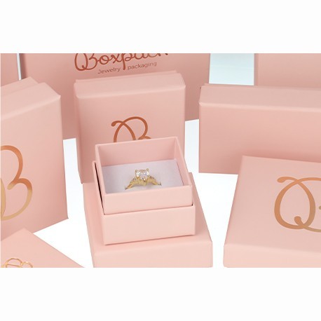 Cajas personalizables de cartón forrada en papel lamindado mate, disponible en color rosa. Interiores de espuma reversible aterciopelada en color blanco y negro, cartón no reversible en color negro o blanco para joyas bisuteria y joyeria.