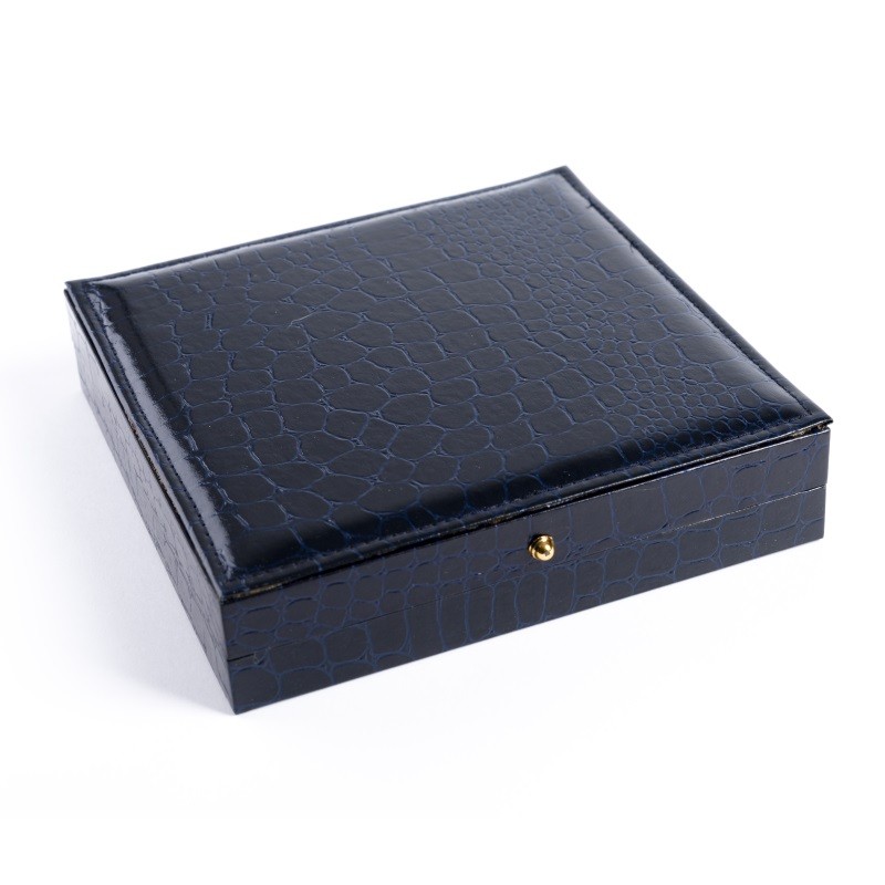 - Estuche forrado en imitación piel de cocodrilo y botón decorativo dorado.