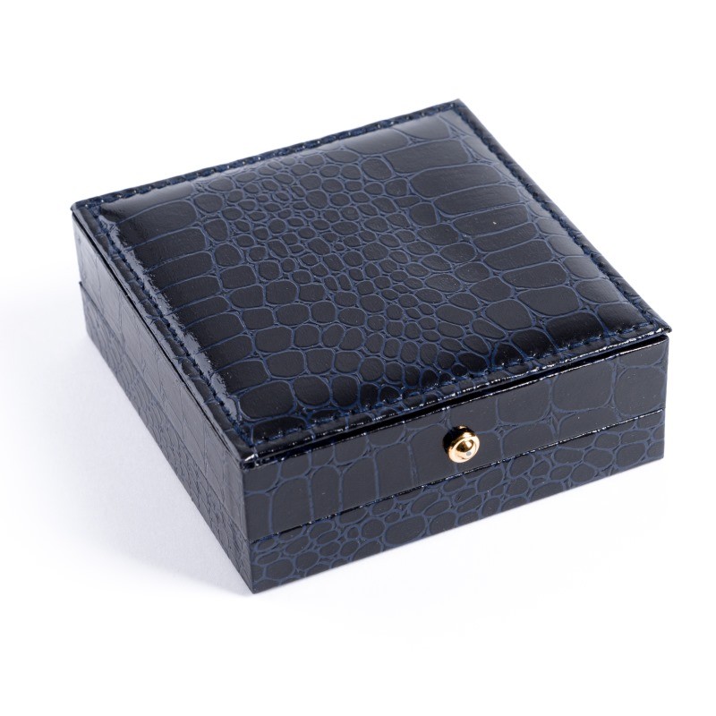 - Estuche forrado en imitación piel de cocodrilo y botón decorativo dorado.