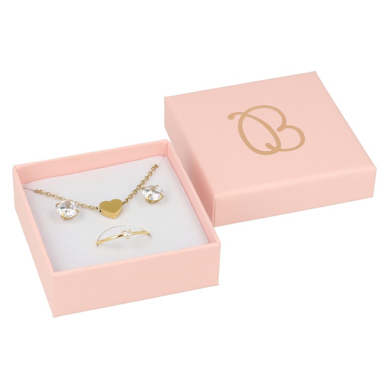 - Caja con interior para juego de sortija, pendientes y colgante de joyería o bisutería.